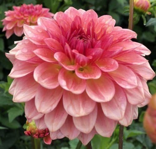 Jabberbox is a stunning formal decorative dahlia known for its soft peach blooms streaked with raspberry-coral tones, creating a flower full of dimension and beauty. Introduced in 1997 by Swan Island Dahlias, this variety is a top performer in the garden, standing tall at 4 to 5 feet and producing 4- to 5-inch blooms. One of the most prolific dahlias, Jabberbox is a reliable bloomer throughout the season, with flowers that change color as summer turns to fall—from raspberry pink early in the season to a smoky peach-coral hue as cooler temperatures set in. Its long, strong stems make it perfect for cutting, providing plenty of blooms for floral arrangements.